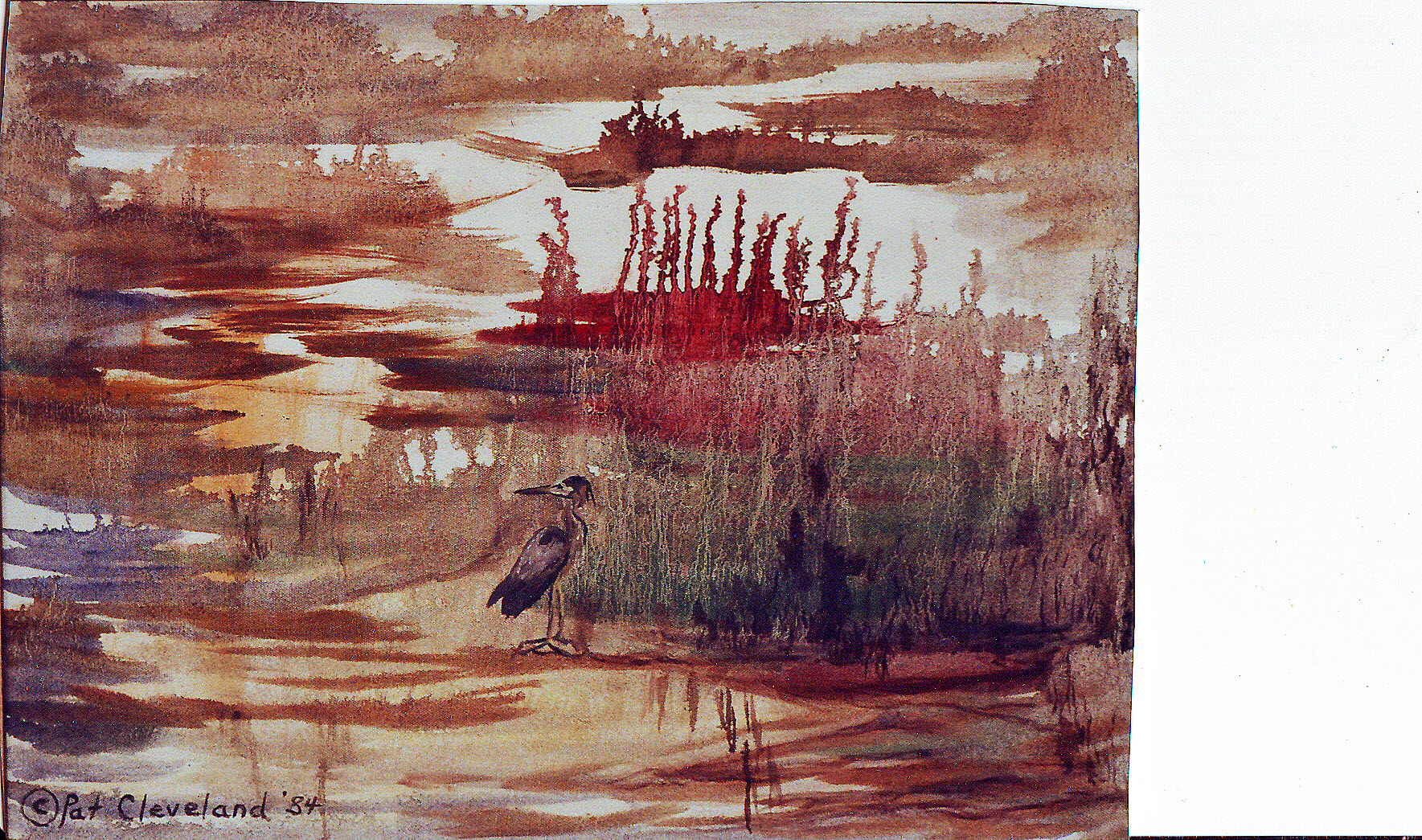 This painting was created in 1984 when I played with letting my paint be very diluted to let it "run" down the canvas. After turning it upside down, I saw what appeared to be marshes and added a bird standing there.