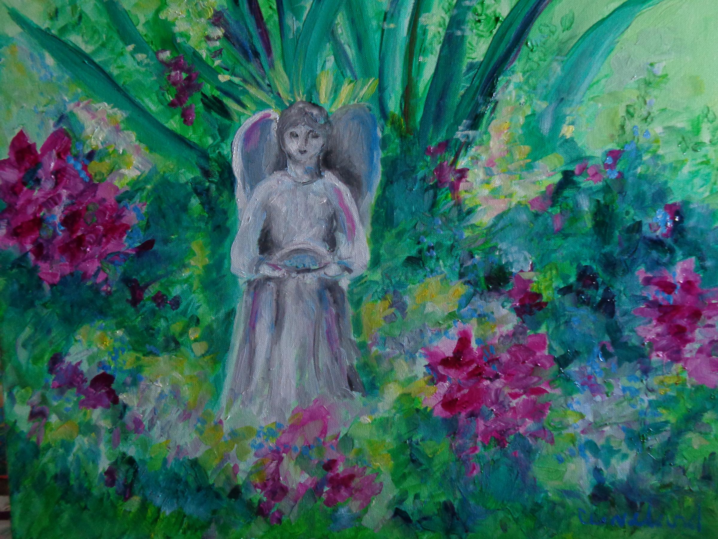 My Garden Angel is an oil on canvas, 20" x 24". Is was inspired by the angel sculpture my daughter gave to me and the artificial flowers my son sent to me that were some of his samples that he sells.