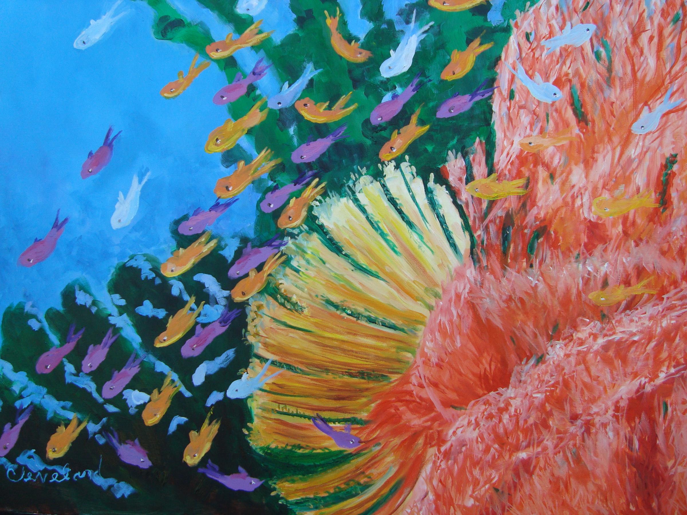 I love the colors of the corals and fish that inspired me to paint this image of a reef.