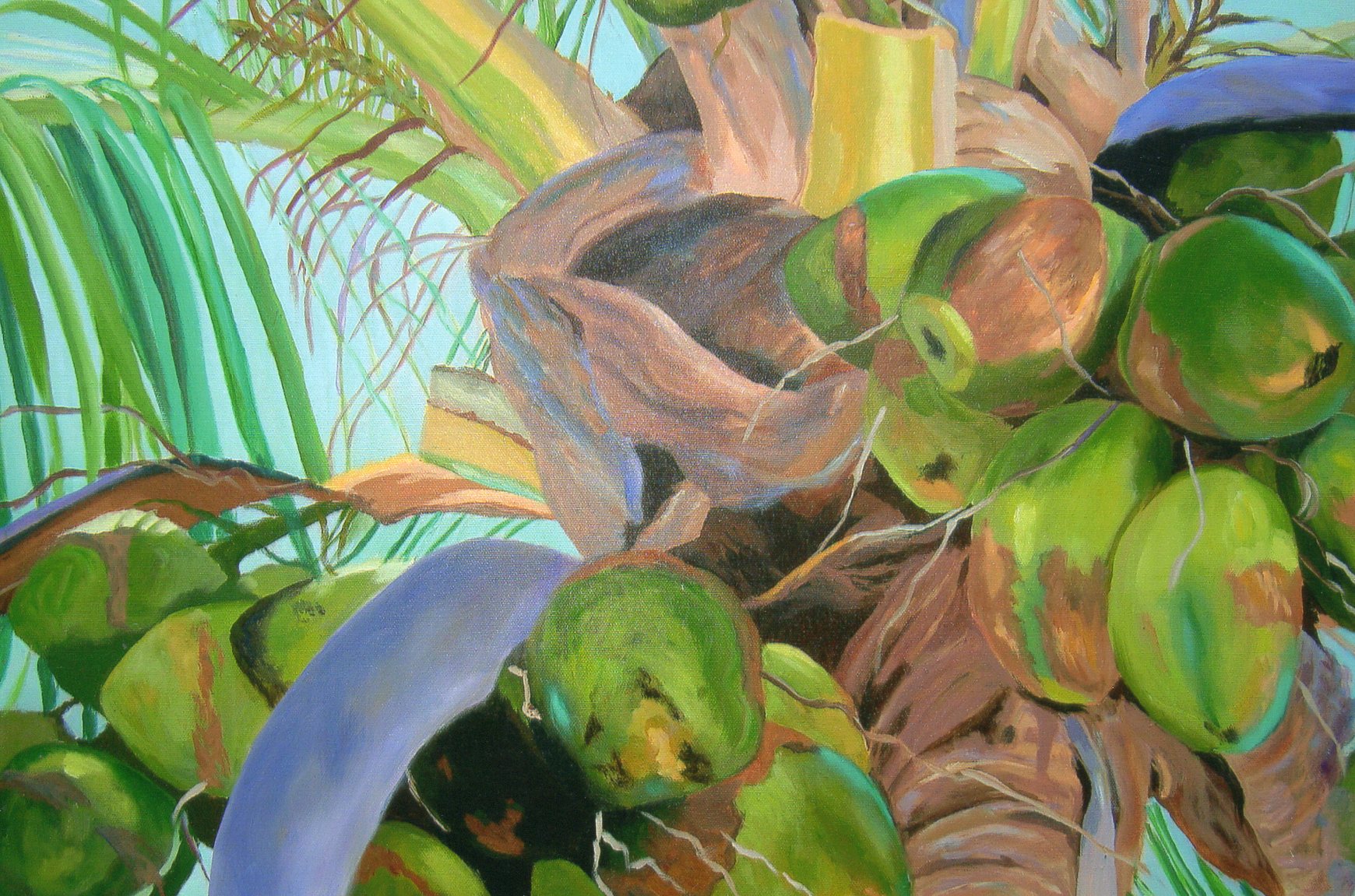 As I often paint in a series, this is one of palms, coconuts, and tropical themes.