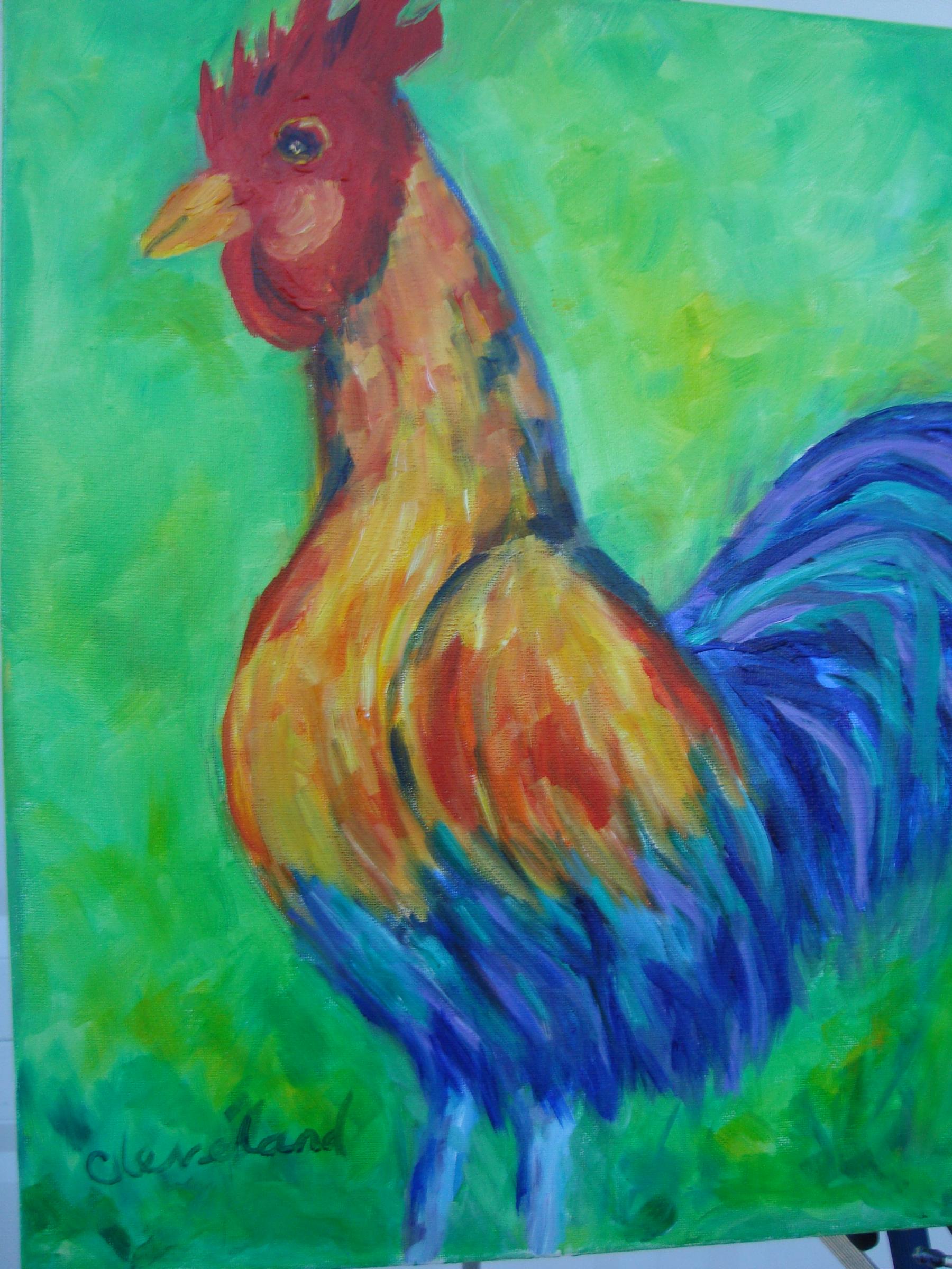 A 16" x 20" oil painting of a rooster of many colors on a bright lime green background.