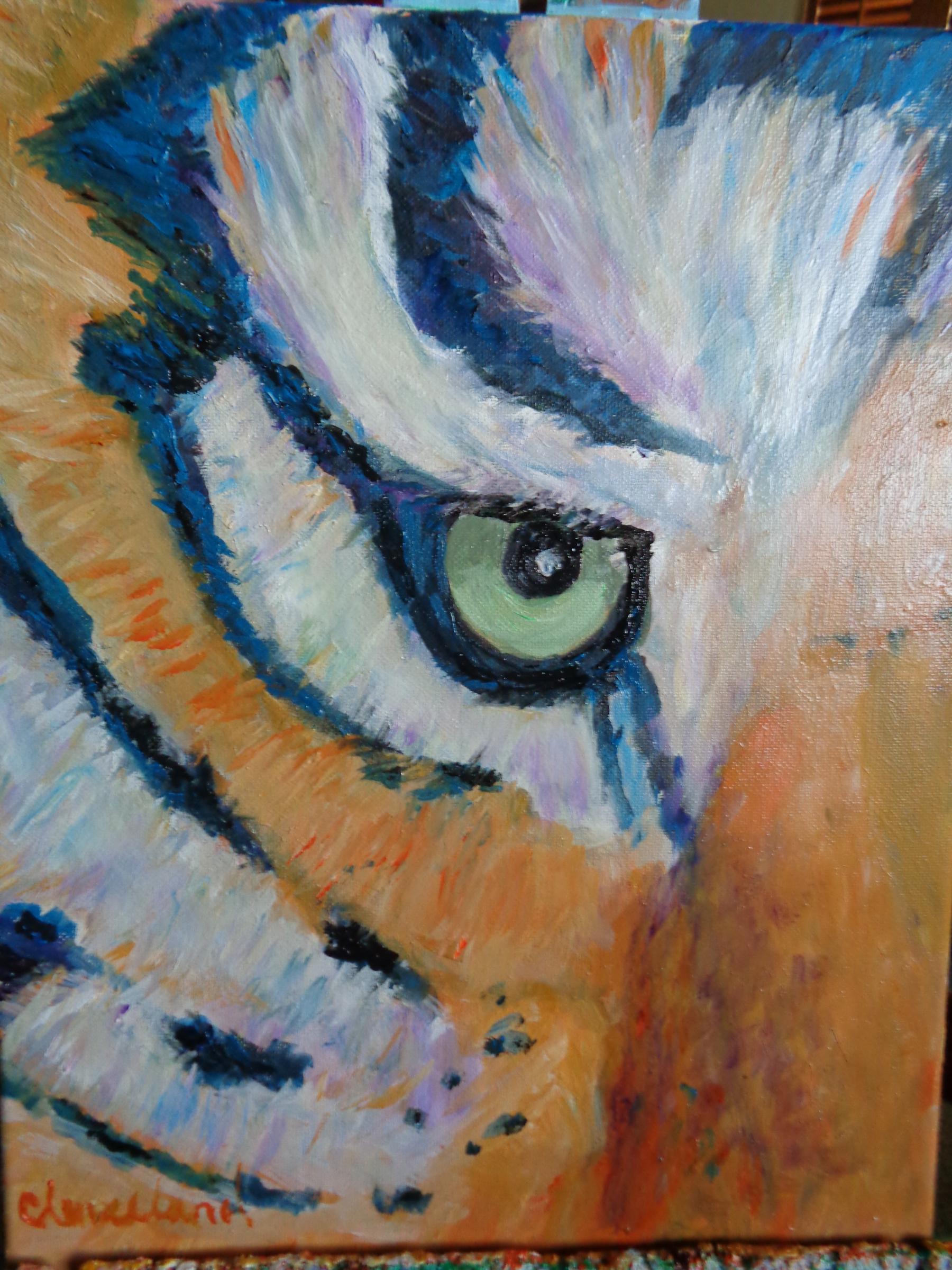 An oil on canvas, Tiger Eye is 11" x 14" depicting a tiger eye peering at the viewer