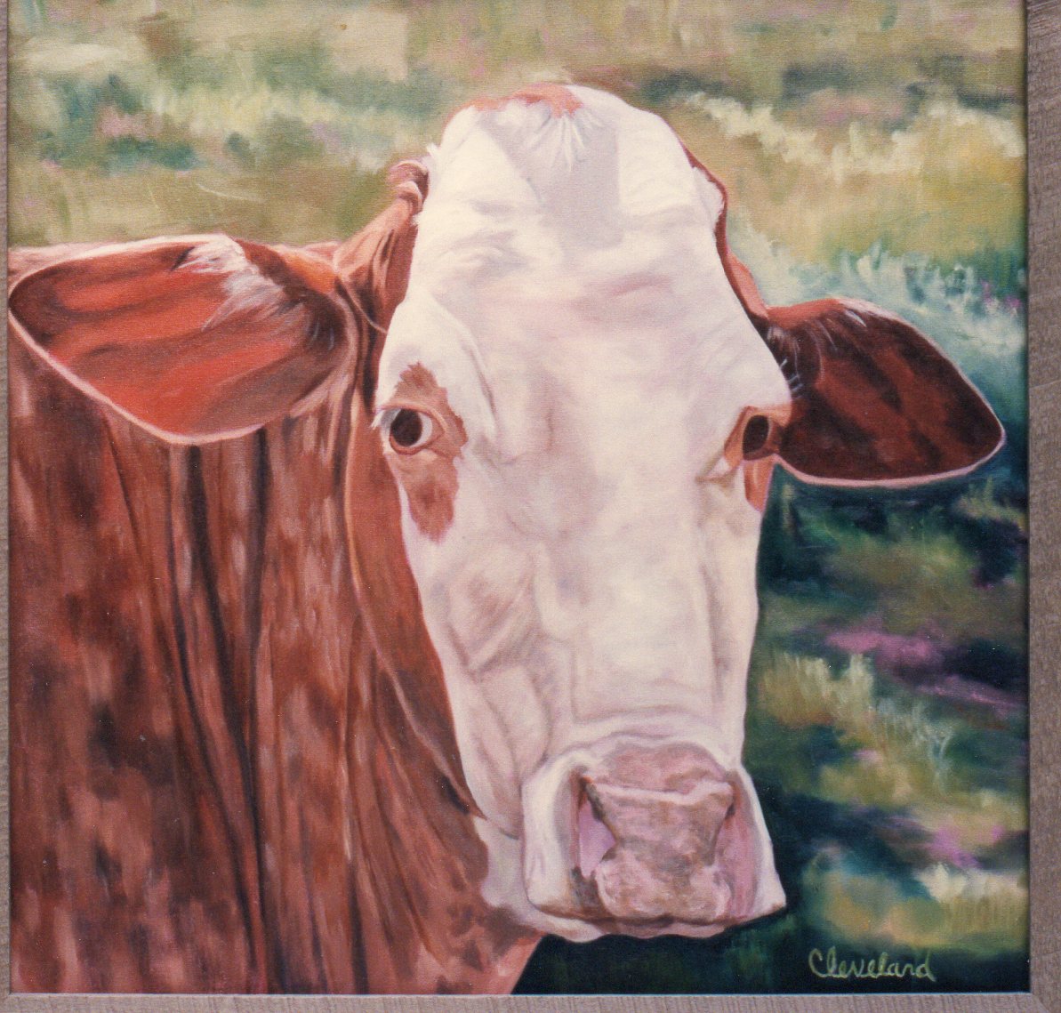 One of 2 cows I painted. I had gone to a field of cows taking pictures with my camera and wondering if the cows would object to my being there. They were merely curious giving me the eye.